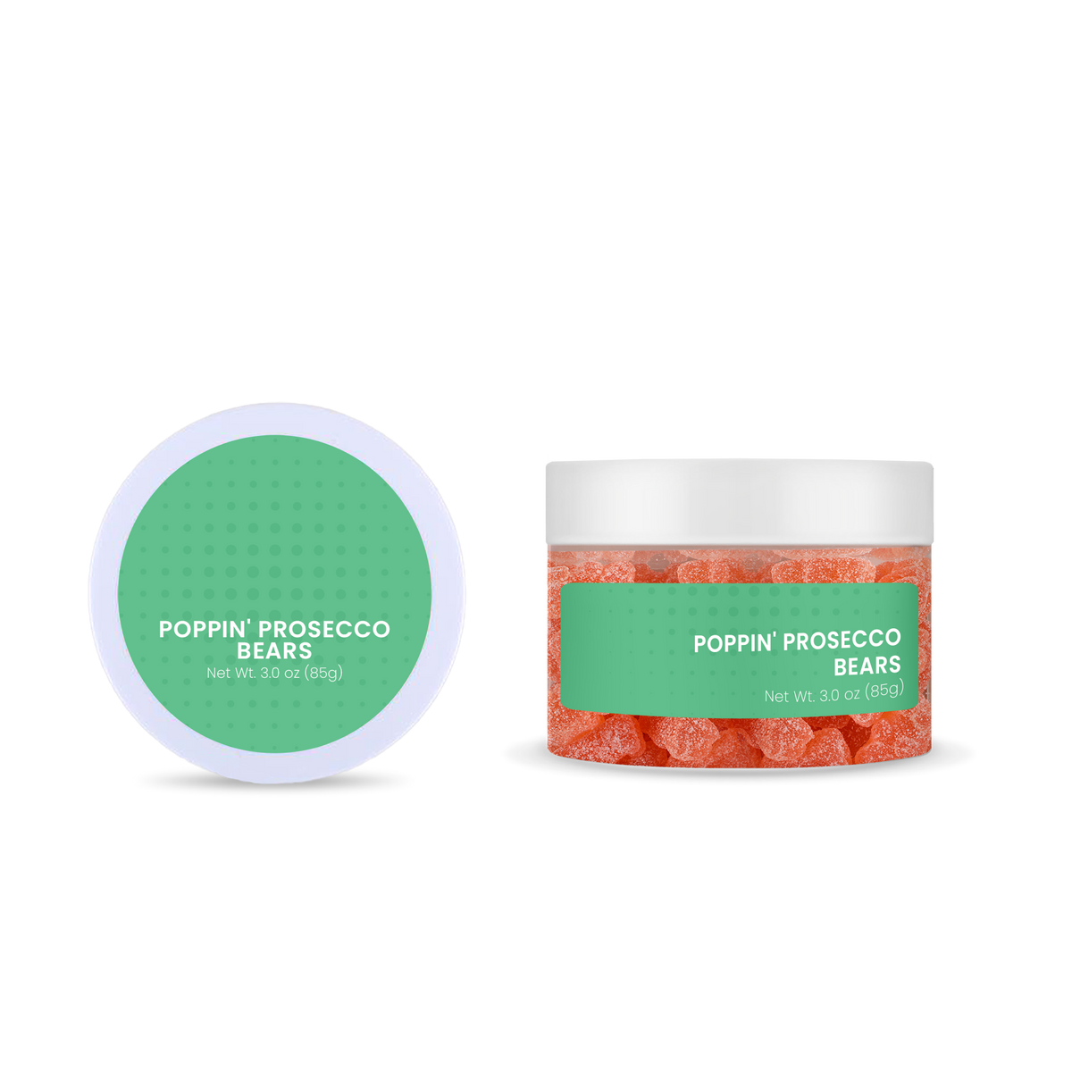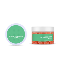 Pop, fizz, clink - it's time for a toast! Enjoy a jar (3 oz) of Poppin' Prosecco Bears - Sweet prosecco-flavored gummy bears finished with tart sugar crystals. Non-alcoholic.